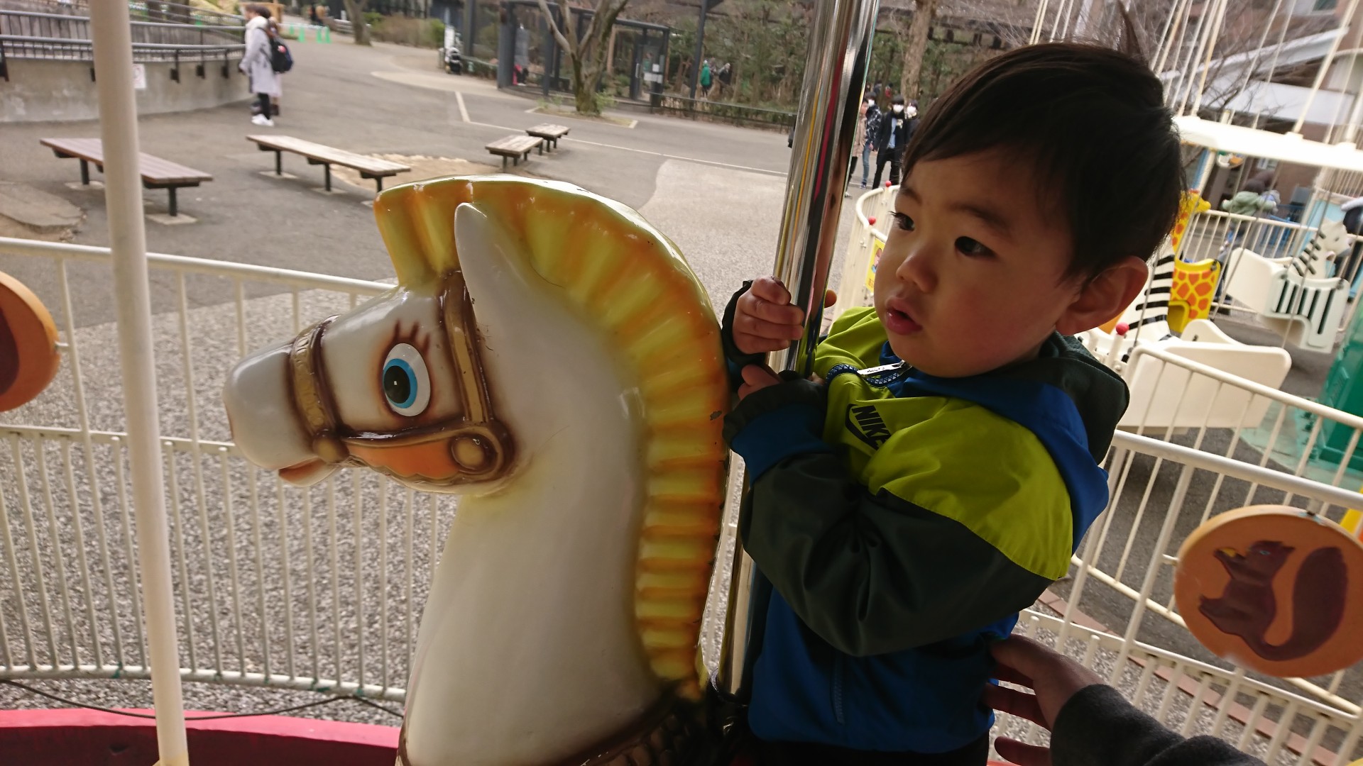 後は初メリーゴーランドと動物行進というブランコのような乗り物で馬に乗った気分を味わったようです。