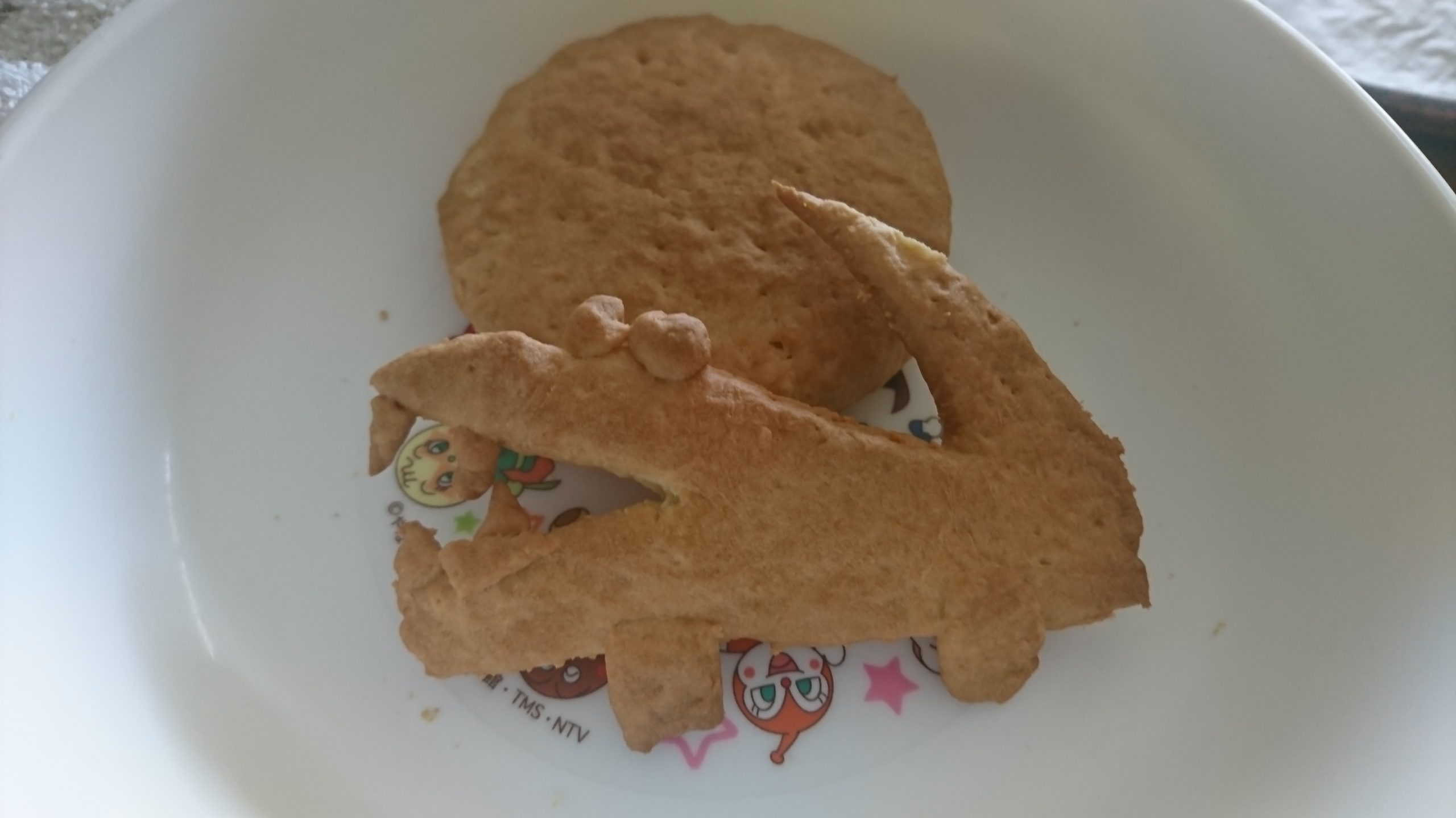 菅平には「型」がなくて、器で代用したので少し大きくなってしまったけど、余った生地で碧人と「ワニクッキー」を。