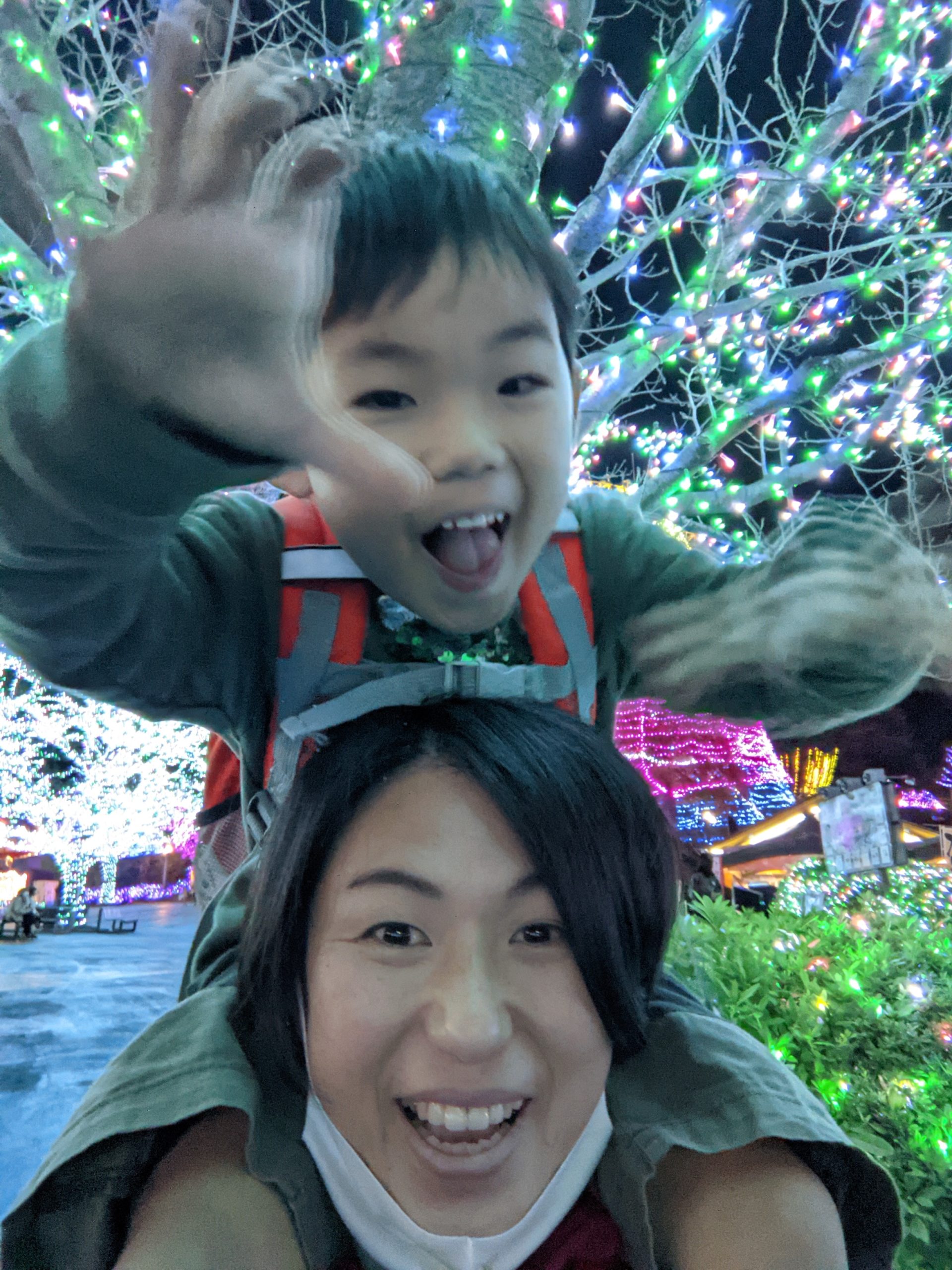 旦那さんの職場が近いので仕事終わりを待つ3時間と少しでしたが、明るい空が暗くなりイルミネーションがすごく綺麗に見える時間まで二人で乗り物に乗り倒し、こんなにも子供の乗り物は楽しかったのか?と思うほど夢中になりました♪
