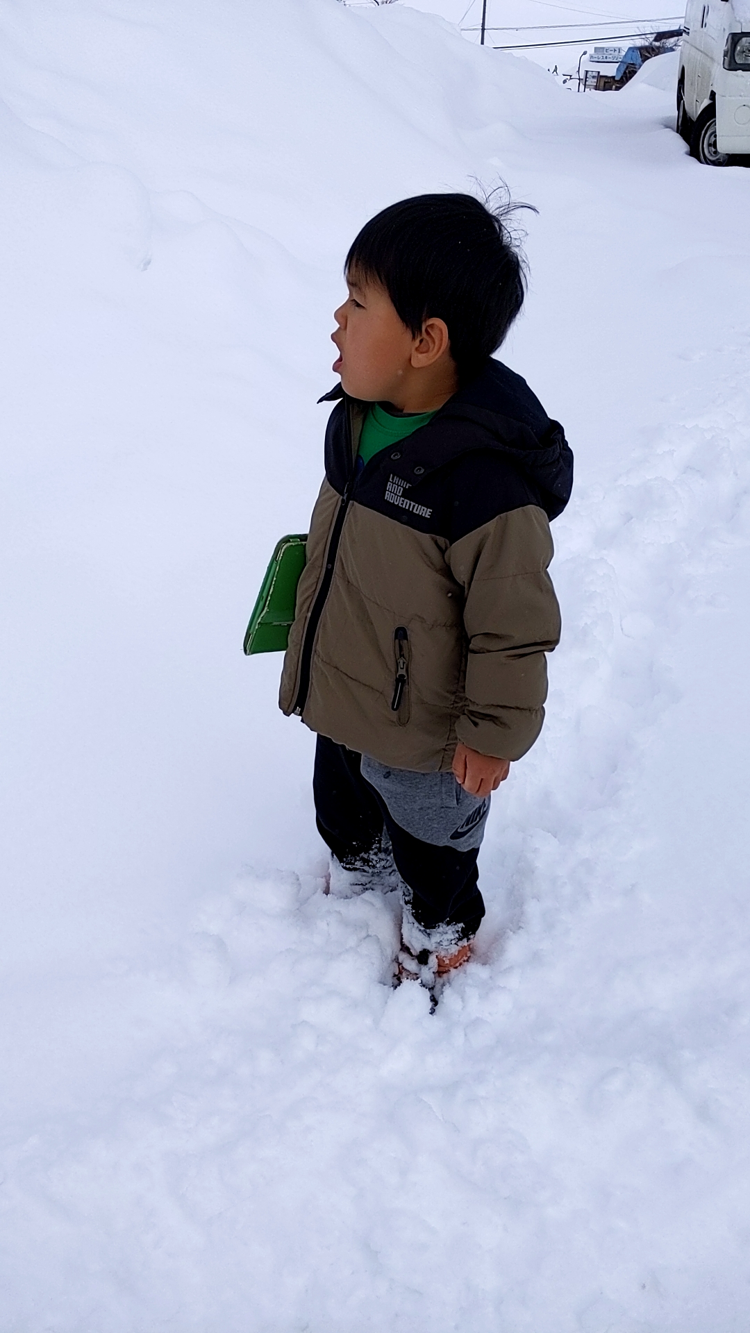 朝起きてみると5センチくらい雪が積もっていて碧人が歩くと長靴でもズボンに雪が…😄